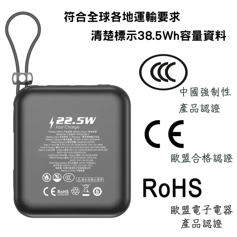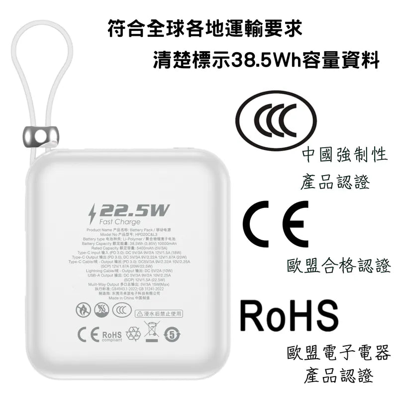 Hedonic 10000mah (38.5Wh) PD 3.0 22.5W Lightning & USB-C 流動充電池 (第三代)|白色|81060|3C CCC認証|