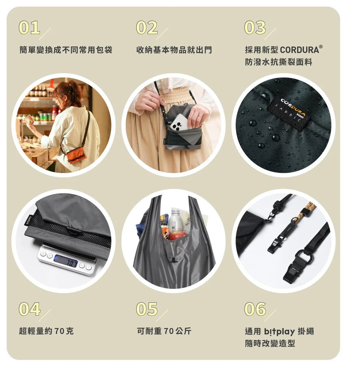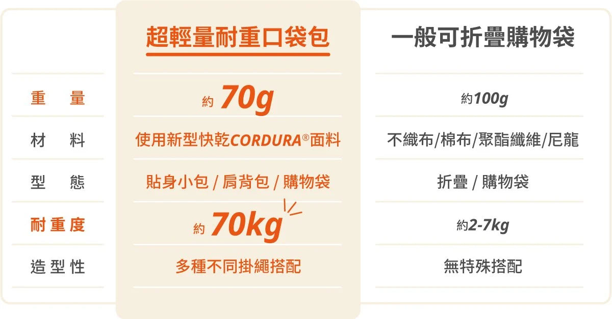 如口袋貼身輕量的大小,放入基本物品即可上身帶出門!口袋包可承重一名成年男子的重量,無須擔憂盡情採買。