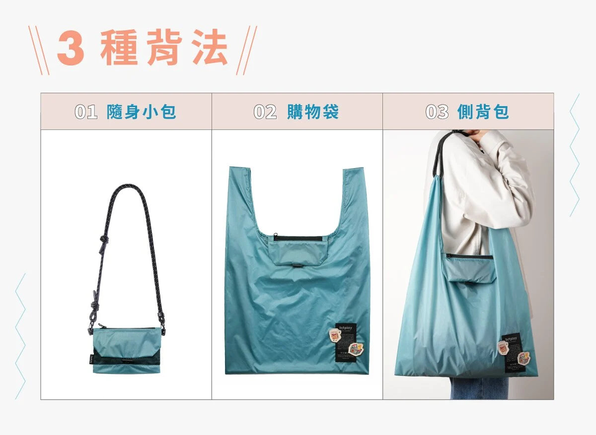 口袋包擁有出門在外最需要的三種包袋形式:隨身小包、購物袋、側背包。不需要麻煩的學習步驟,直覺翻轉,就能快速變身: