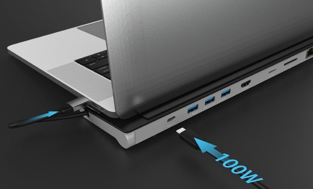 能外接最高達 PD 100W 的 USB-C 電源供應器 (需另購),除了能對筆電充電,也能確保接於擴充 基座上的周邊擁有足夠的運作電源。