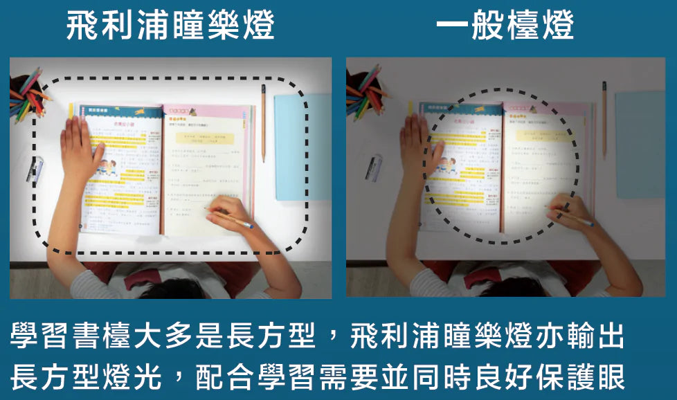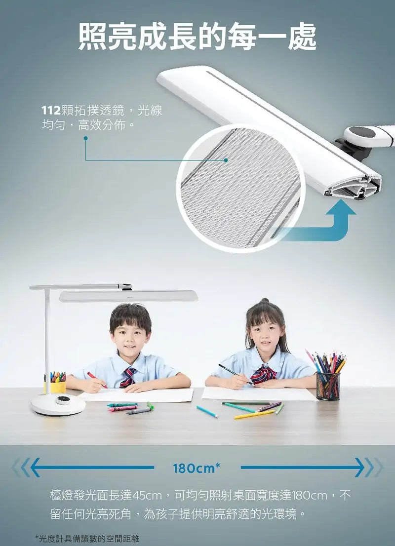 ○ AA級光效 搭配不對稱式光學設計 ,將均勻光 線導向工作及閱讀區域