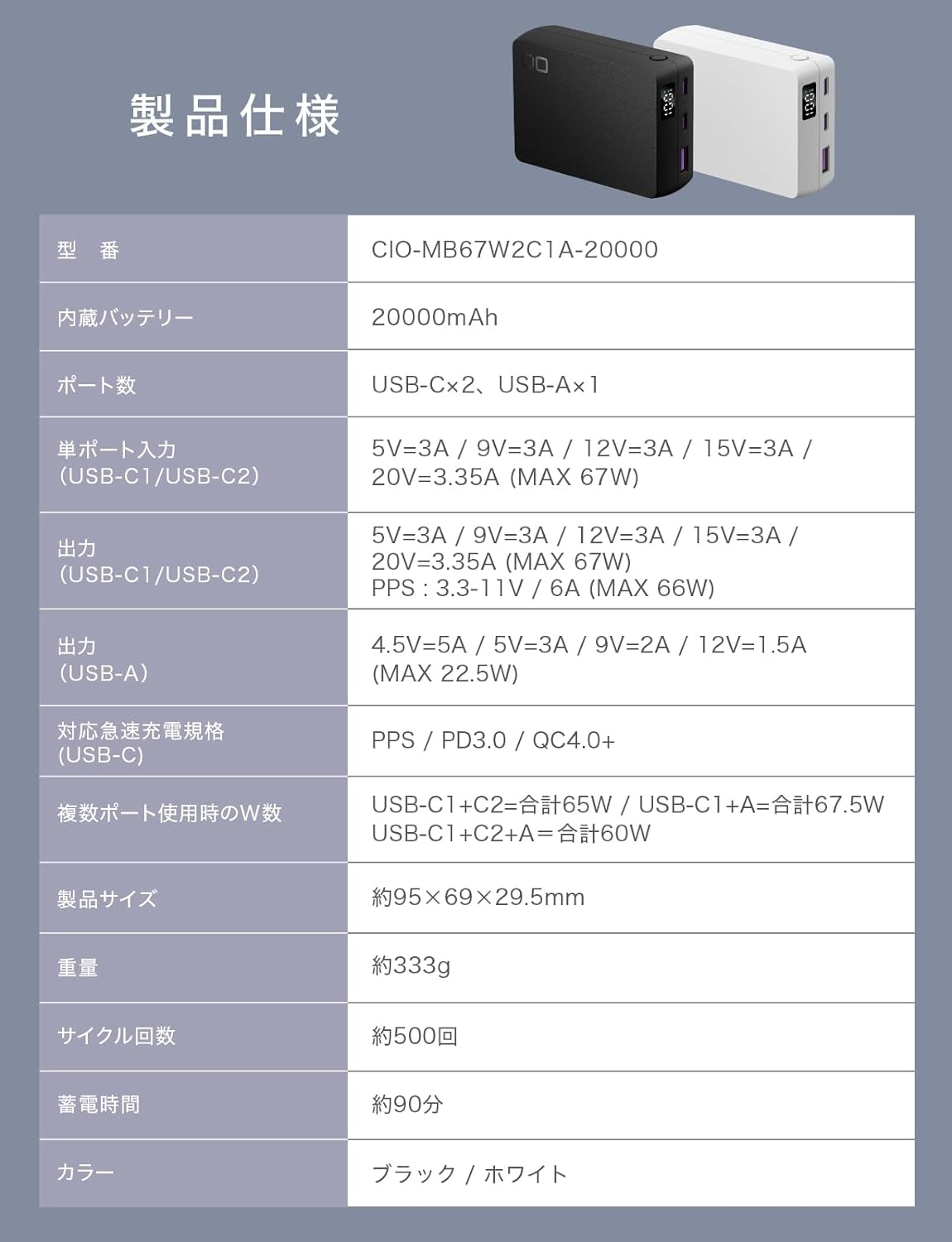 • USB-C1 (45W) + A (22.5W) 合計 67.5W