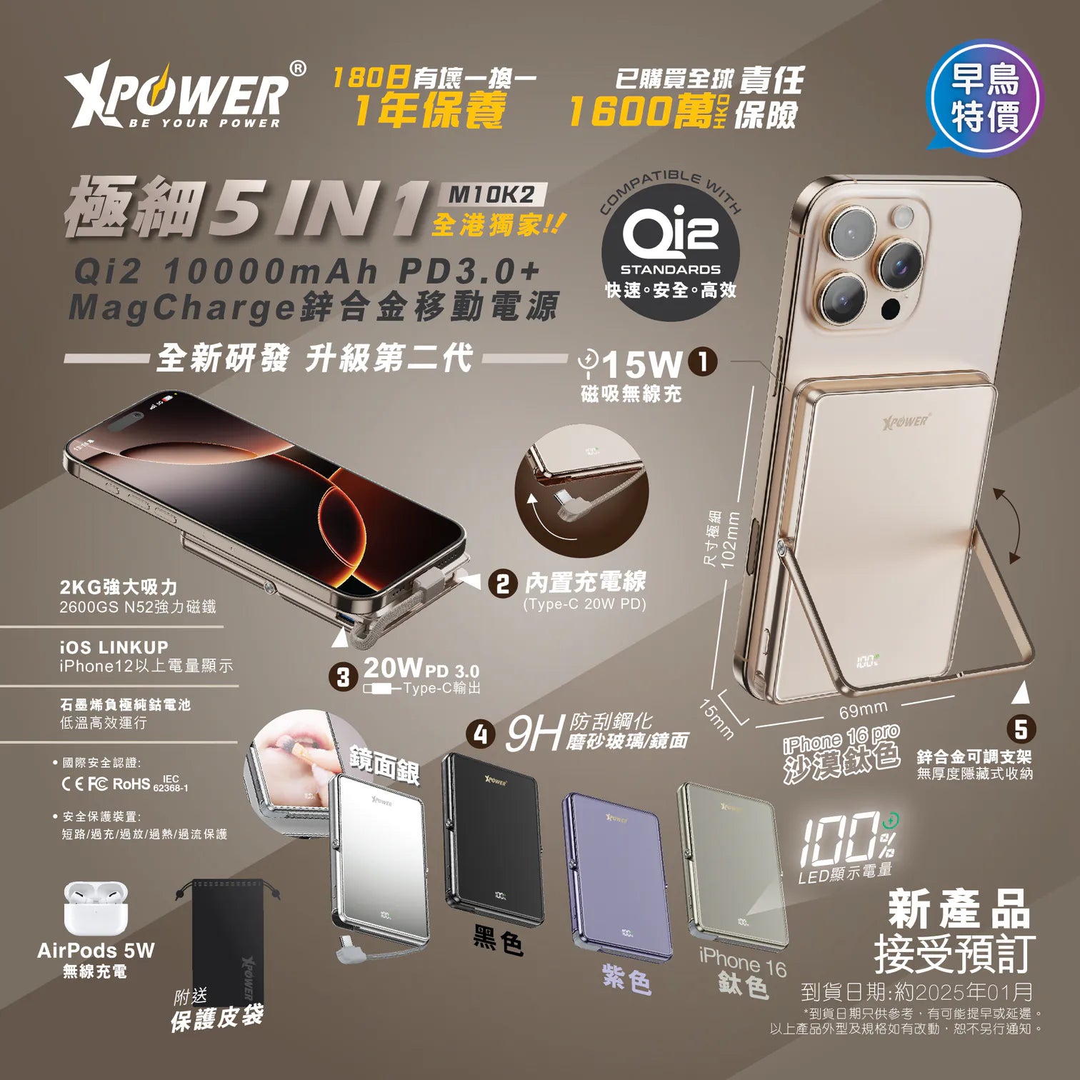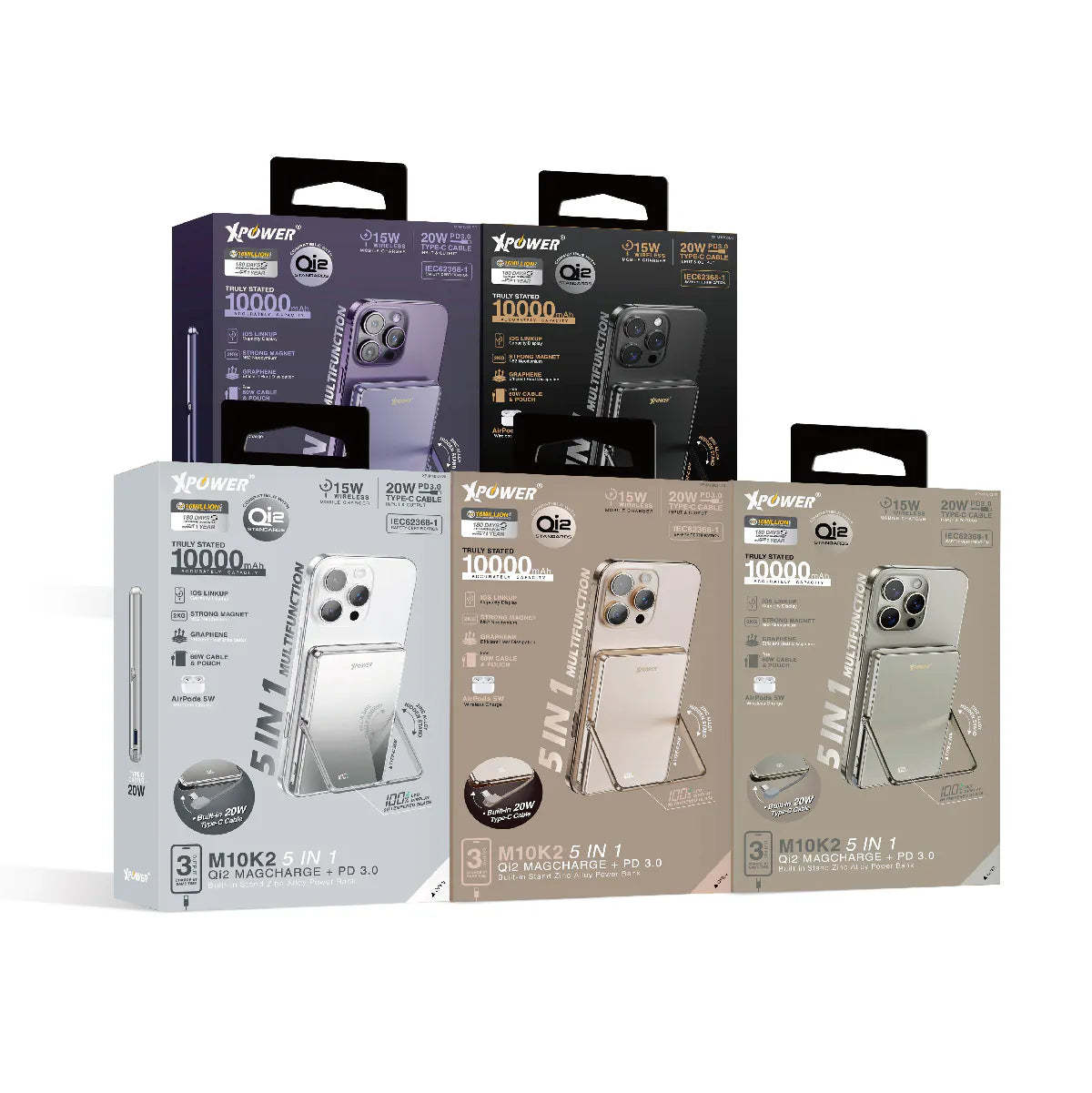 XPower M10K2 5合1鋅合金支架數顯 10000mAh PD3.0+QI2 磁吸移動電源 - [香港行貨]
