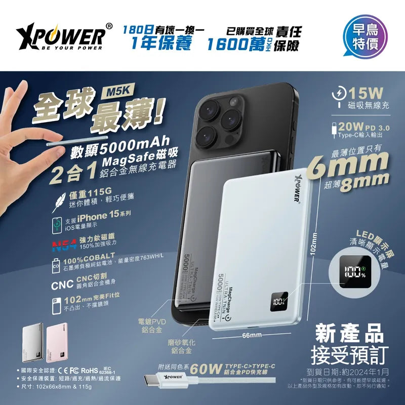 XPOWER M5K 2合1鋁合金數顯 5000mAh PD3.0+磁吸無線外置充電器 [香港行貨]