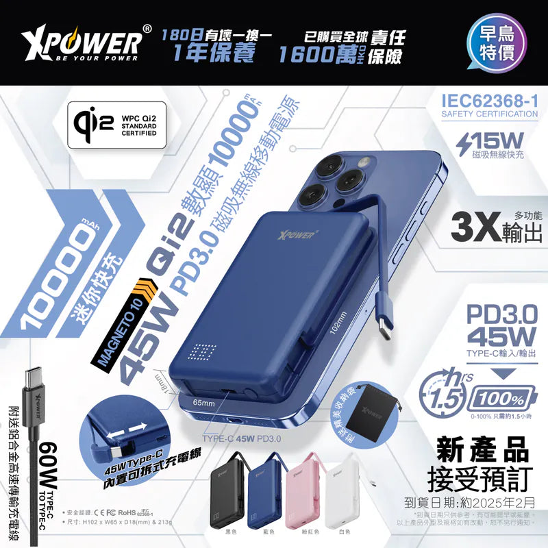 XPower MAGNETO 10 Qi2數顯 10000mAh 45W PD3.0 磁吸無線移動電源 - 香港行貨