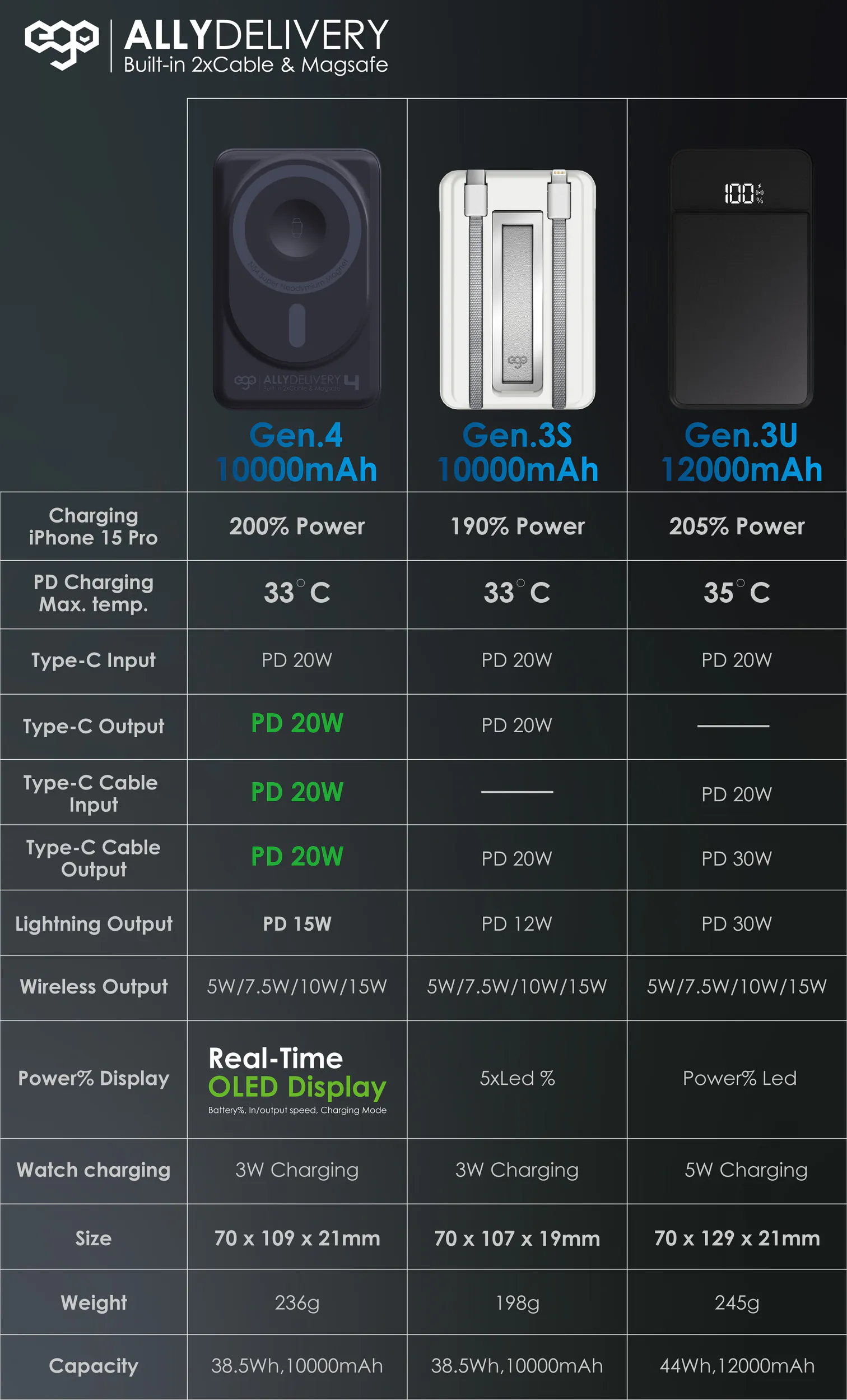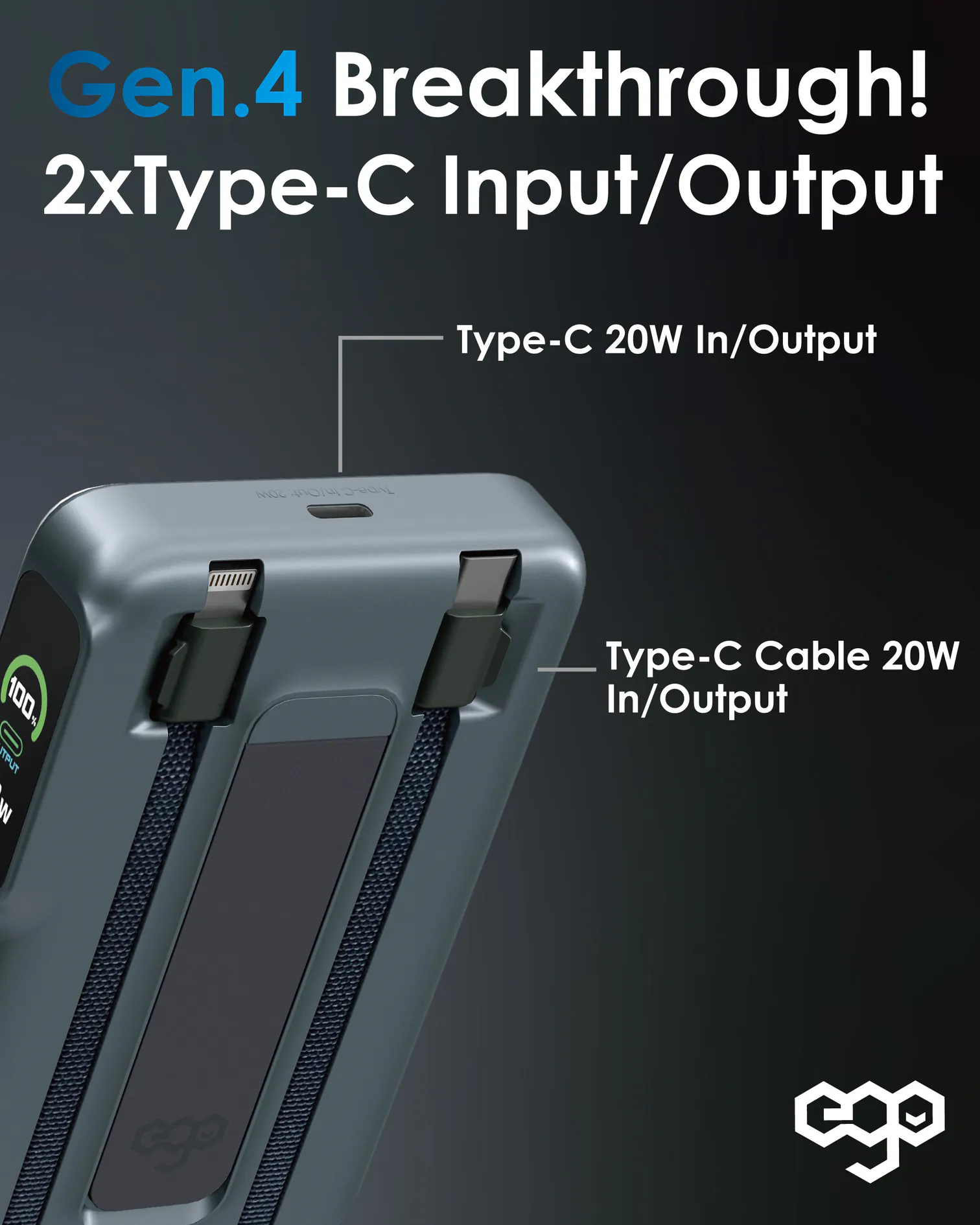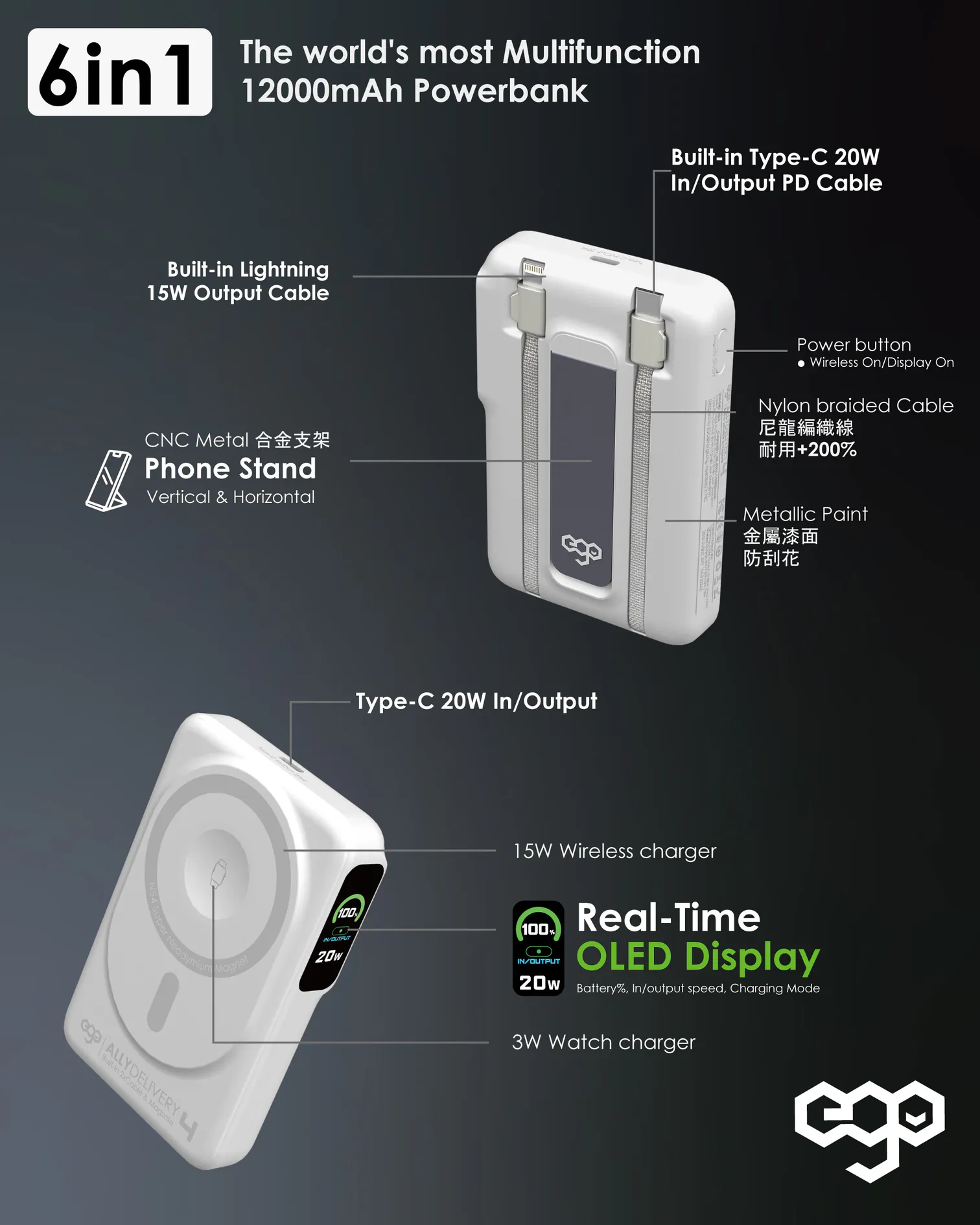 0. 新增雙快充 in/output Type-C口 & Type-C內置線