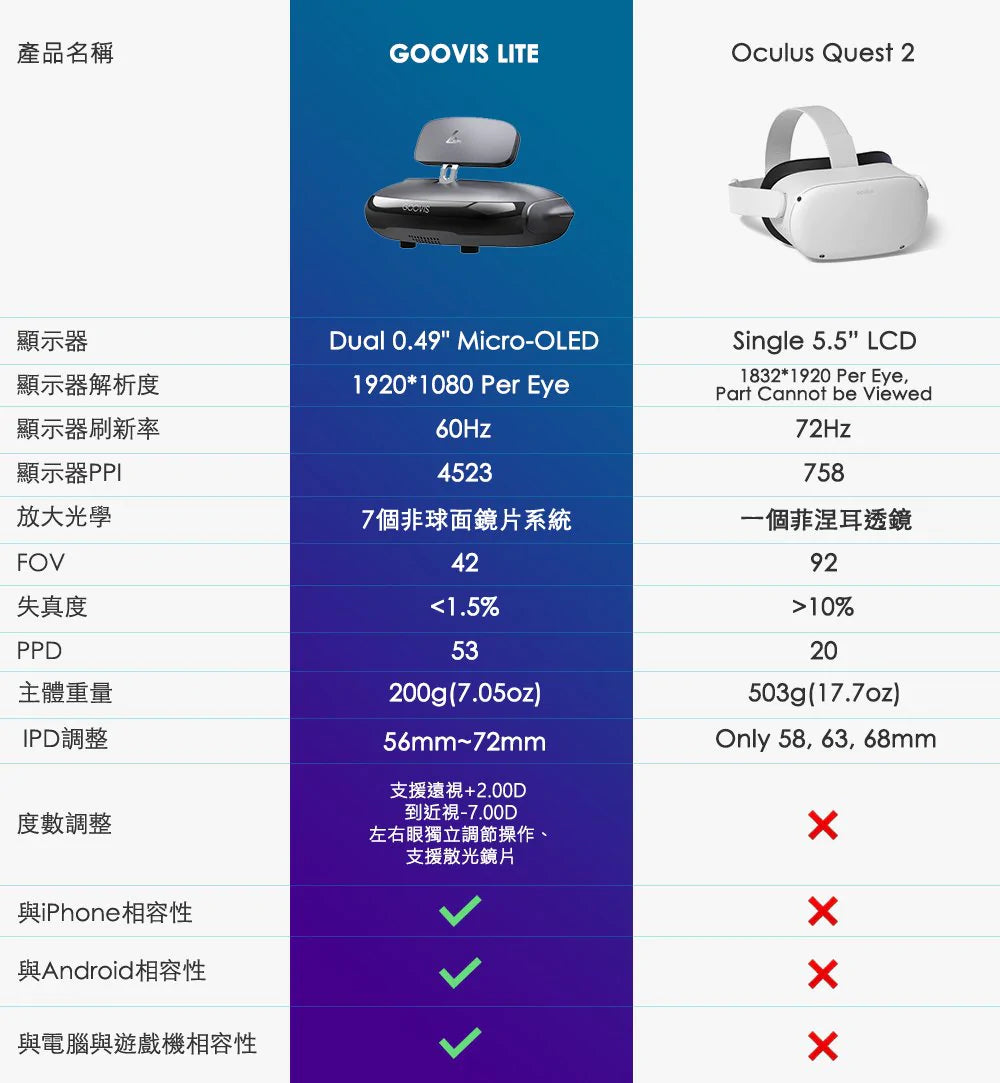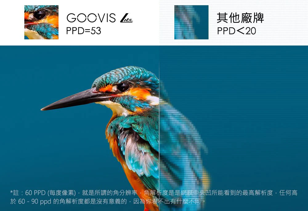 53 PPD(每度像素)是目前業內最高的數字。GOOVIS LITE 突破了極限,將其帶入了更高的境界。 清除所有界線! 其圖像密度是Apple iPhone 12 Pro顯示螢幕的9倍(是其他頭戴顯示器(HMD)的3倍),將210萬像素(1920 x 1080)塞進0.49英寸(1.2 mm),您將擁有一個圖像更流暢、更清晰、細節更真實生動的視覺饗宴。