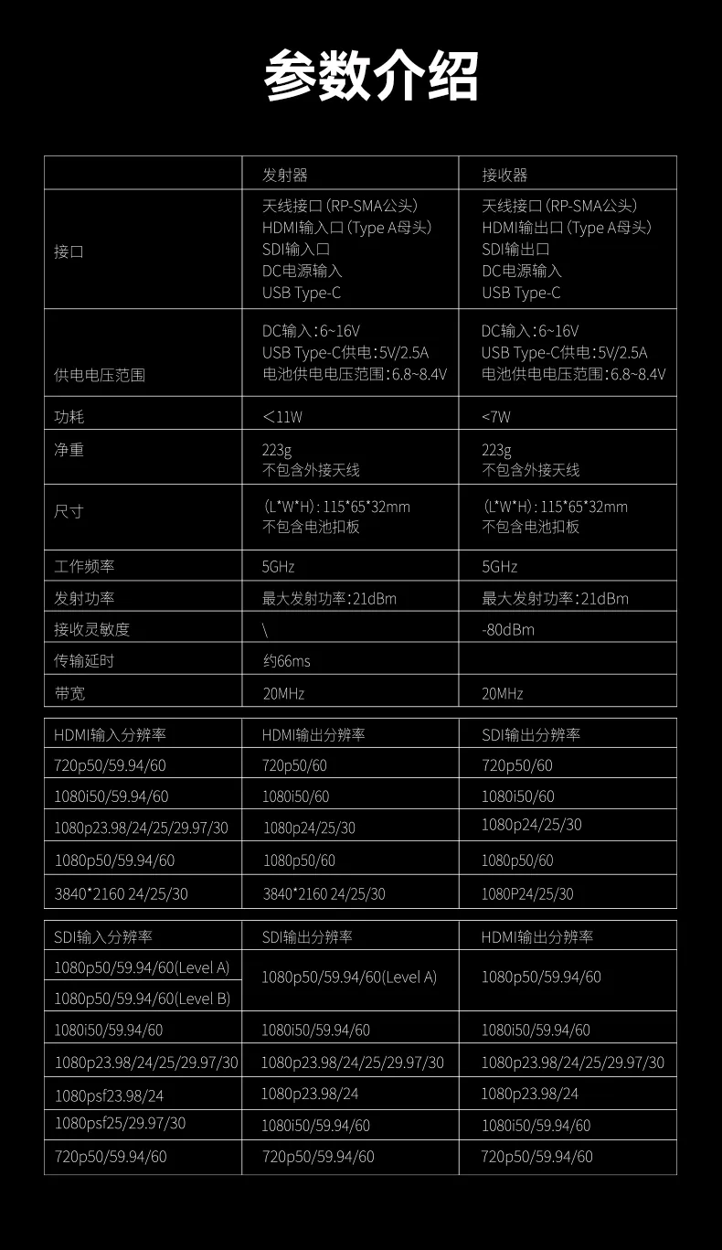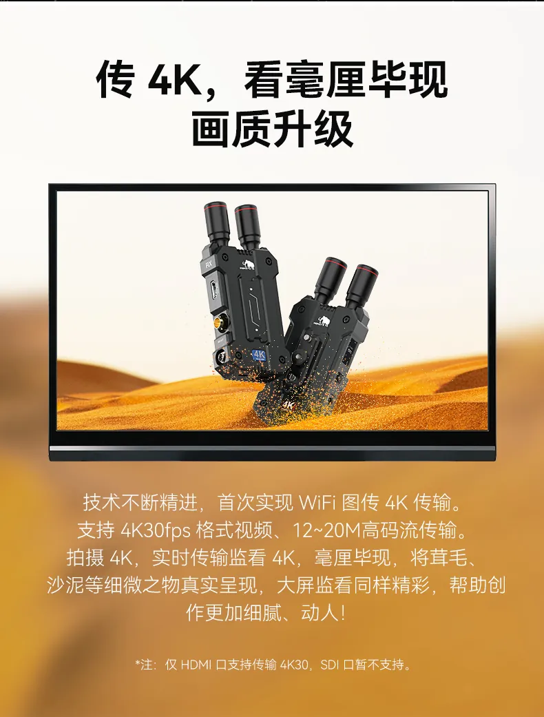 Mars 4K 支持 UHD 4K30 視頻傳輸,適合尋求高分辨率製作能力的挑剔攝像師。 Mars 4K 還支持不同幀速率的 FHD 和 HD 格式,例如 24、30 和 60p。