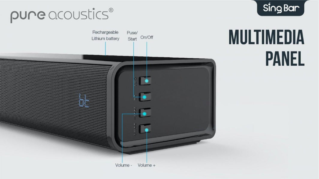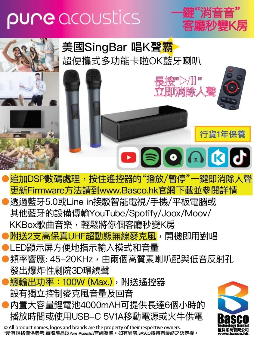 Pure Acoustics SingBar 便攜式卡啦OK藍牙喇叭 (配備遙控器及雙卡拉OK麥克風) 黑色 [香港行貨]