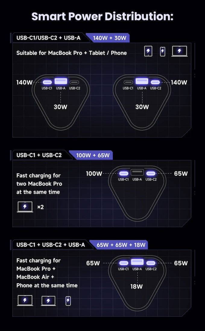 配有 2 個 USB-C 和 1 個 USB-A 端口,可同時為 3 台設備快速充電。 即使所有連接埠都在使用中,您仍然可以從任一 USB-C 連接埠獲得高達 65W 的快速充電。