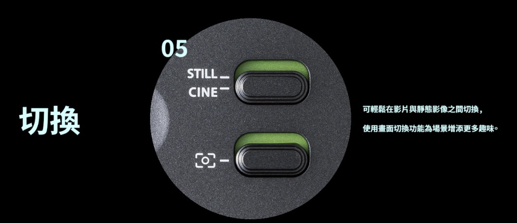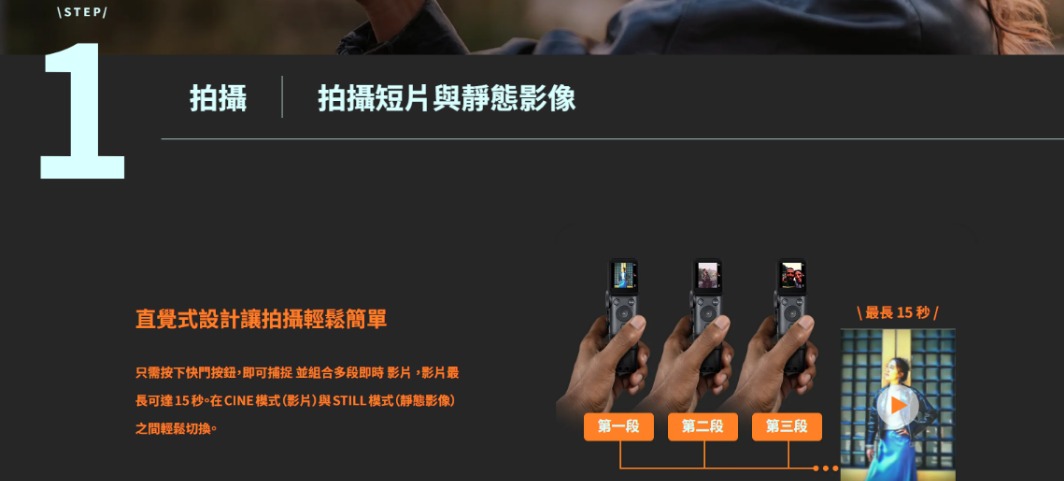 • 只需按下快門按鈕,即可捕捉 並組合多段即時 影片 ,影片最長可達15秒。在CINE模式(影片)與STILL模式(靜態影像)之間輕鬆切換。