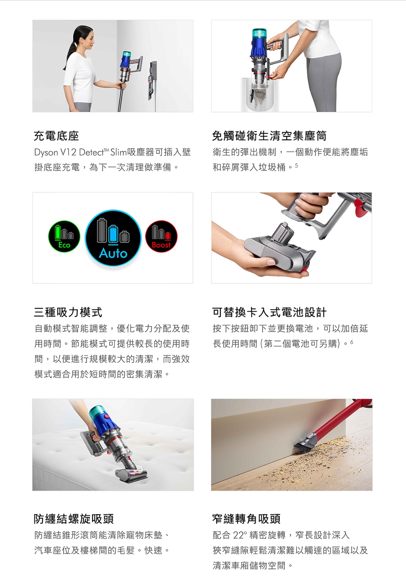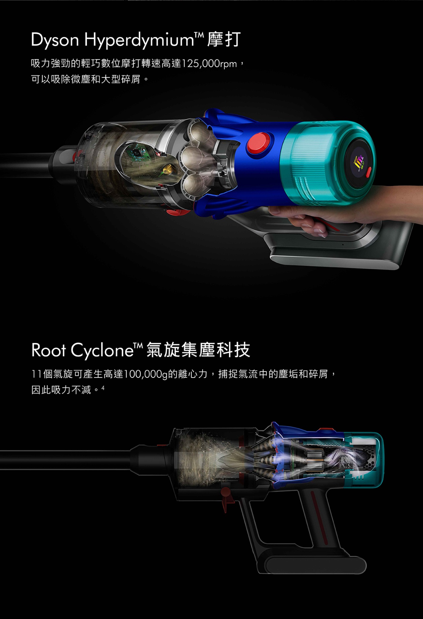 • Dyson Hyperdymium™ 摩打A powerful and lightweight digital motor with a speed of up to 125,000 RPM, generating a strong suction of 140AW, easily tackling various cleaning challenges.