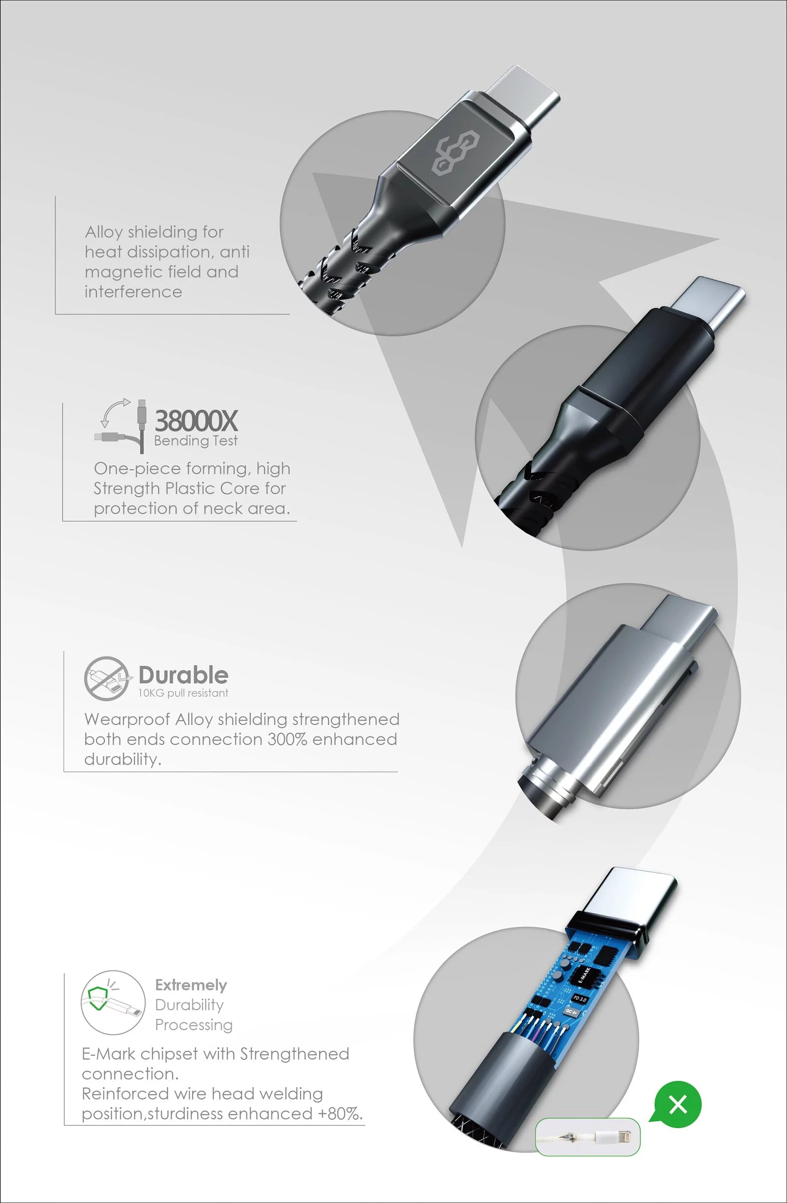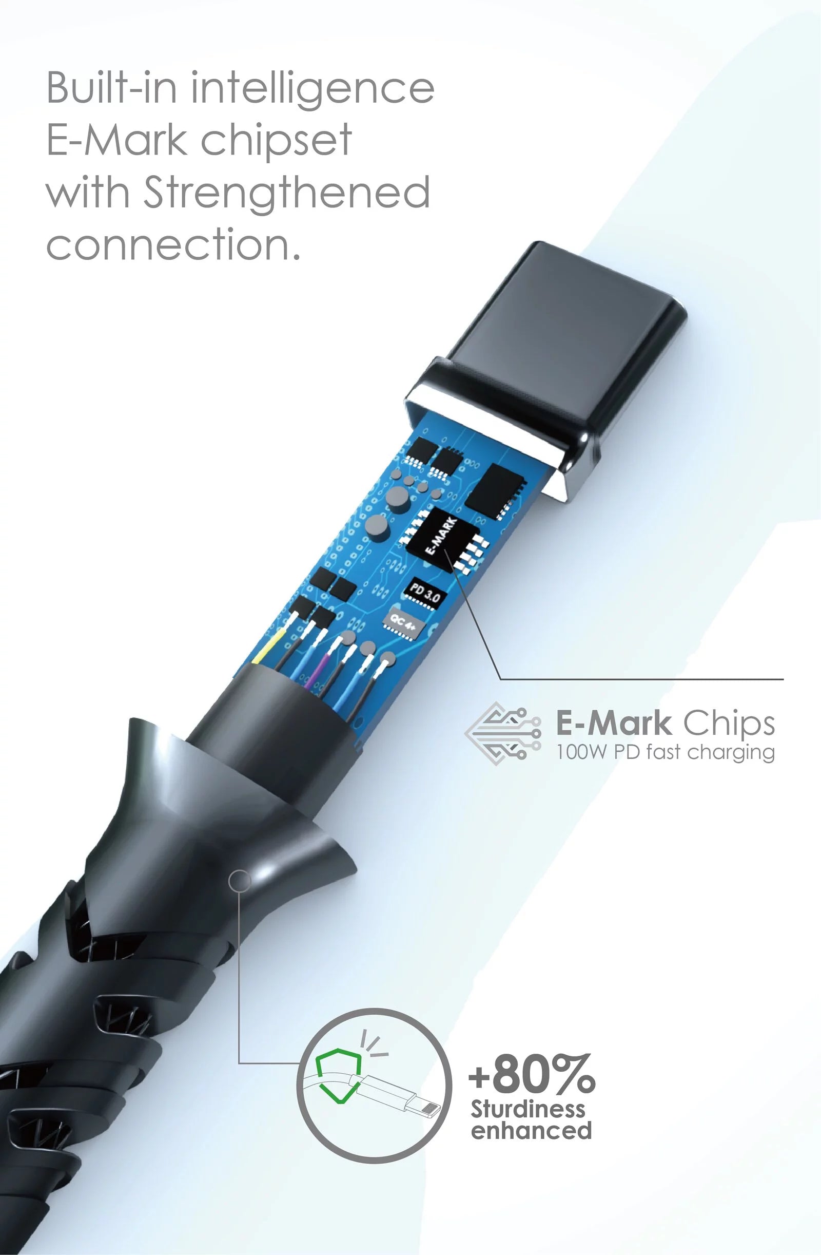 Extremely Durable Handling: Features enhanced connection capabilities with E-Mark chipset. Reinforced soldering points at the wire ends, increasing sturdiness by +80%