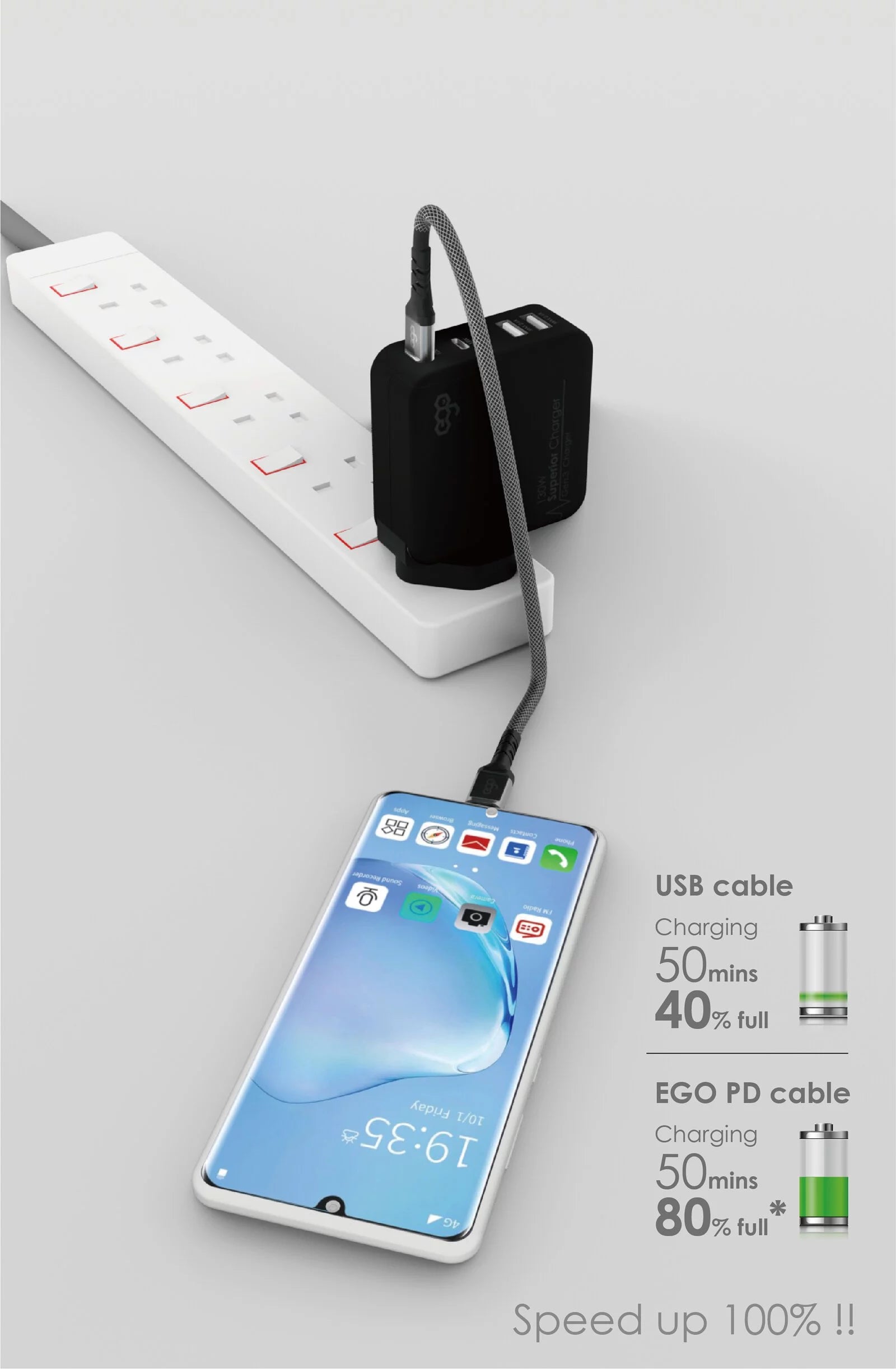 • Charging with EGO PD cable: 50 minutes progress is about 80%, roughly twice as fast.