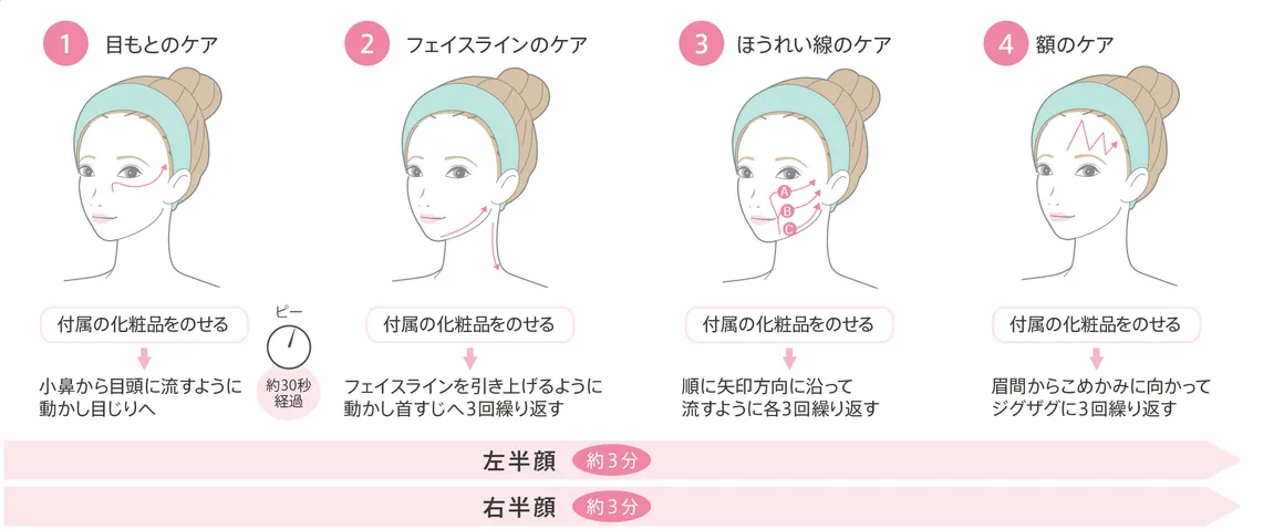 ④ Forehead care: Starting from the center of the eyebrows, glide back and forth along the temples 3 times.