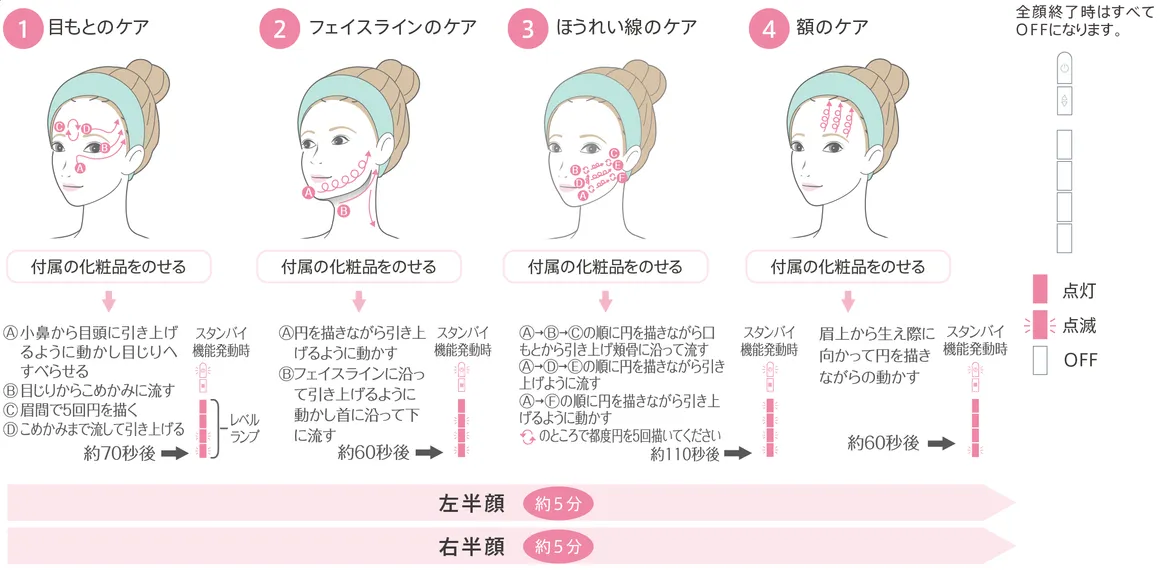 Please apply the included cosmetic radio frequency beauty device gel essence. Move in the order indicated by the arrows, from ① to ④. After completing the care on the left side of the face, please ensure to care for the right side of the face in the same manner.