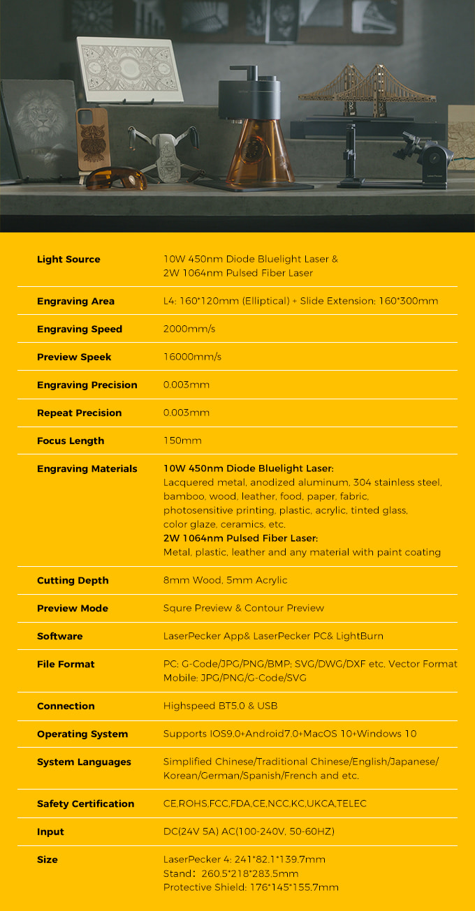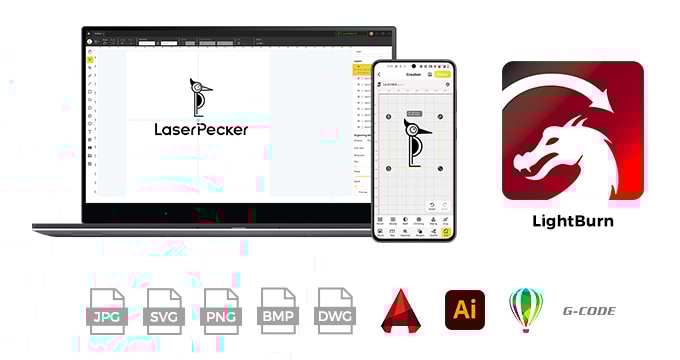 The upgraded version of mobile and PC app will be released along with LaserPecker4, giving you a more flexible and creative experience. The new app is shipped with a brand new and powerful Creation module, that supports multi-layer editing, variable engraving settings, multi-format image import, and many more image editing features. It also comes with a new community feature that allows users to share creative engravings as well as preferred settings. Lastly, by popular demand, the LaserPecker 4 is now compatible with LightBurn.