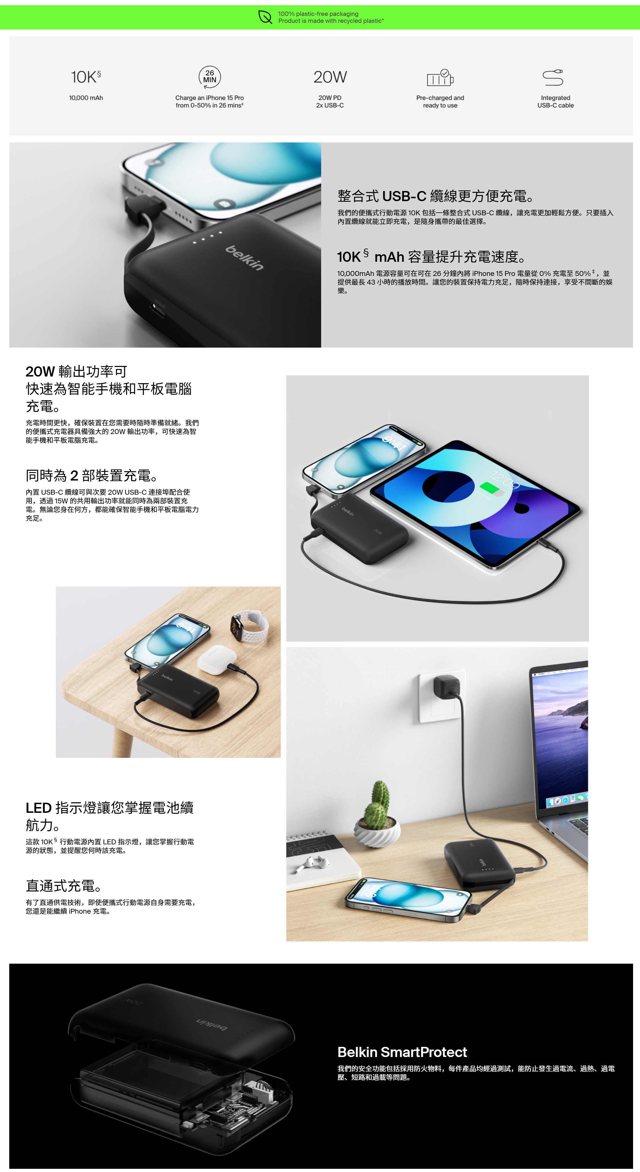 BELKIN BoostCharge Power Bank 10K 10000mAh 外置充電器 Built-in TYPE -C 充電線 [香港行貨] | CCC 認證
