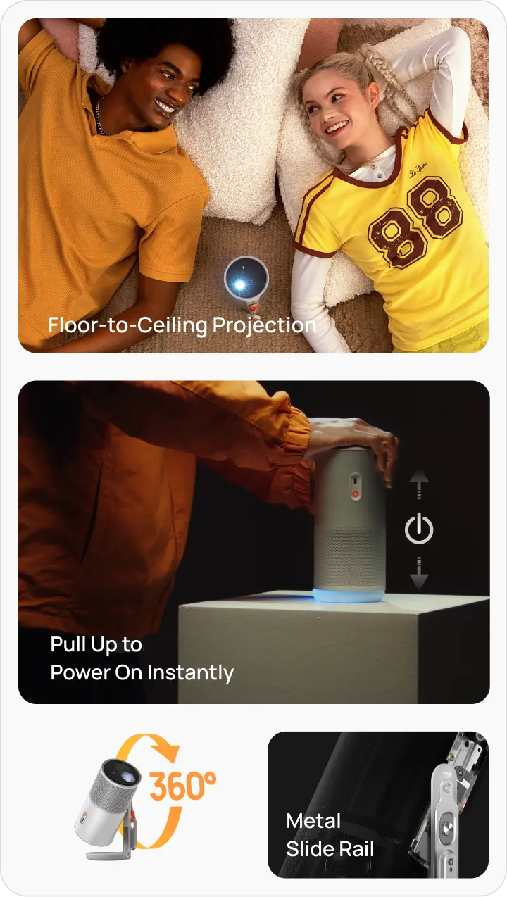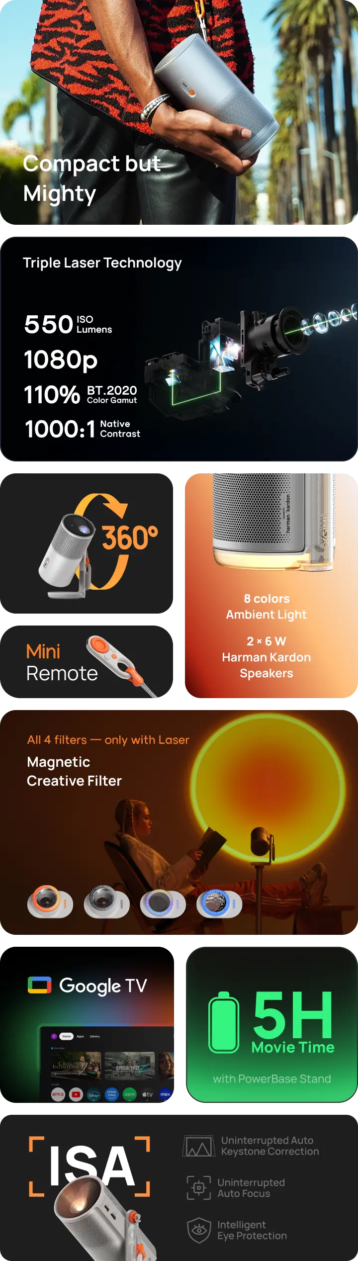 • •360° 可調式內建支架: MoGo 4 Laser 配備 360° 通用可調式支架和 ISA 技術,可自動校準和調整影像,從任何角度呈現完美畫面。從地板到天花板,投影到任何表面,以您的方式享受您喜愛的影音內容。