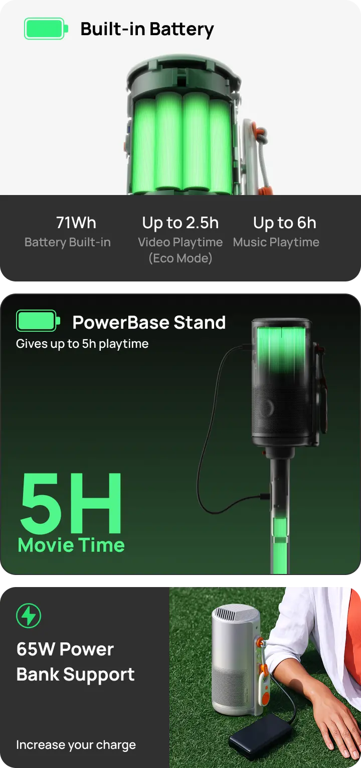 • 內建電池,樂趣無限:長達 2.5 小時的播放時間,隨時隨地暢享大螢幕娛樂,是難忘露營之旅的完美之選。*可另購搭配 PowerBase 支架,更可延長觀看時間,長達 5 小時。