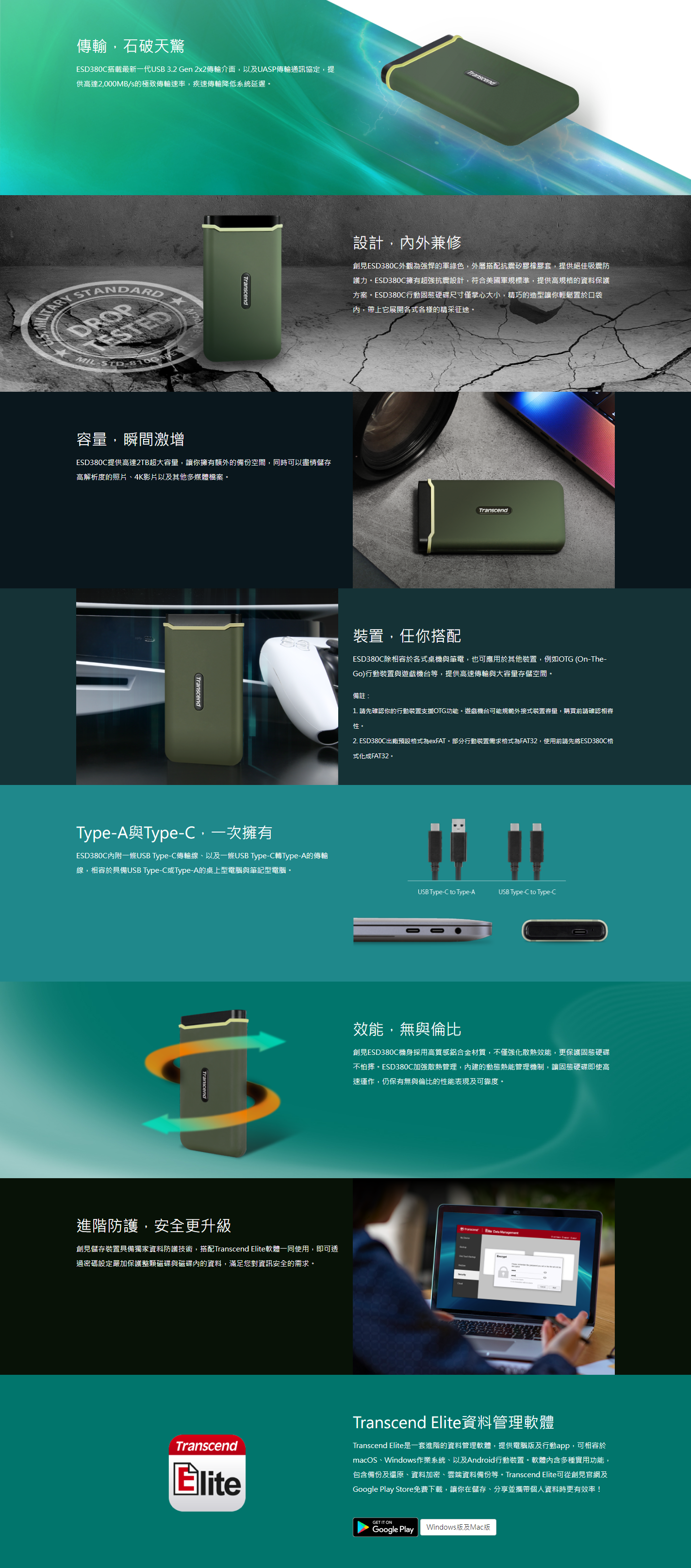 創見ESD380C行動固態硬碟搭載USB 3.2 Gen 2x2傳輸介面,創造史無前例的傳輸速度。抗震矽膠橡膠套搭配強悍軍綠色,為儲存資料帶來充分保護。輕巧的外觀可儲存高達2TB的資料,無疑是行動儲存的最佳選擇。