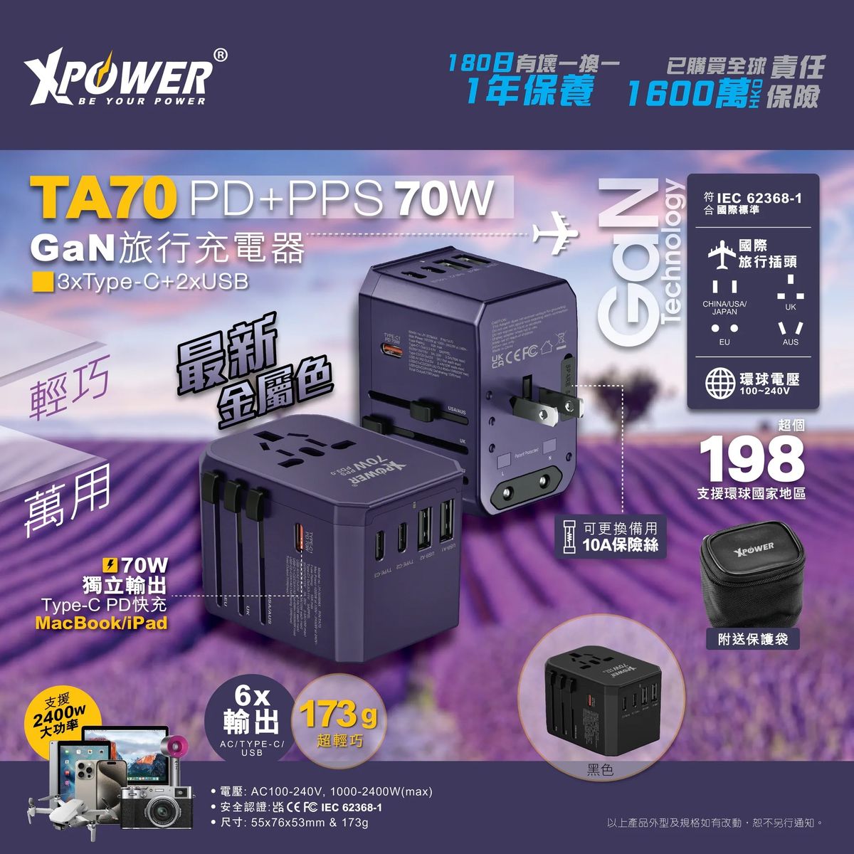 XPower TA70 6輸出PD/PPS 70W Gan旅行充電器 [香港行貨]