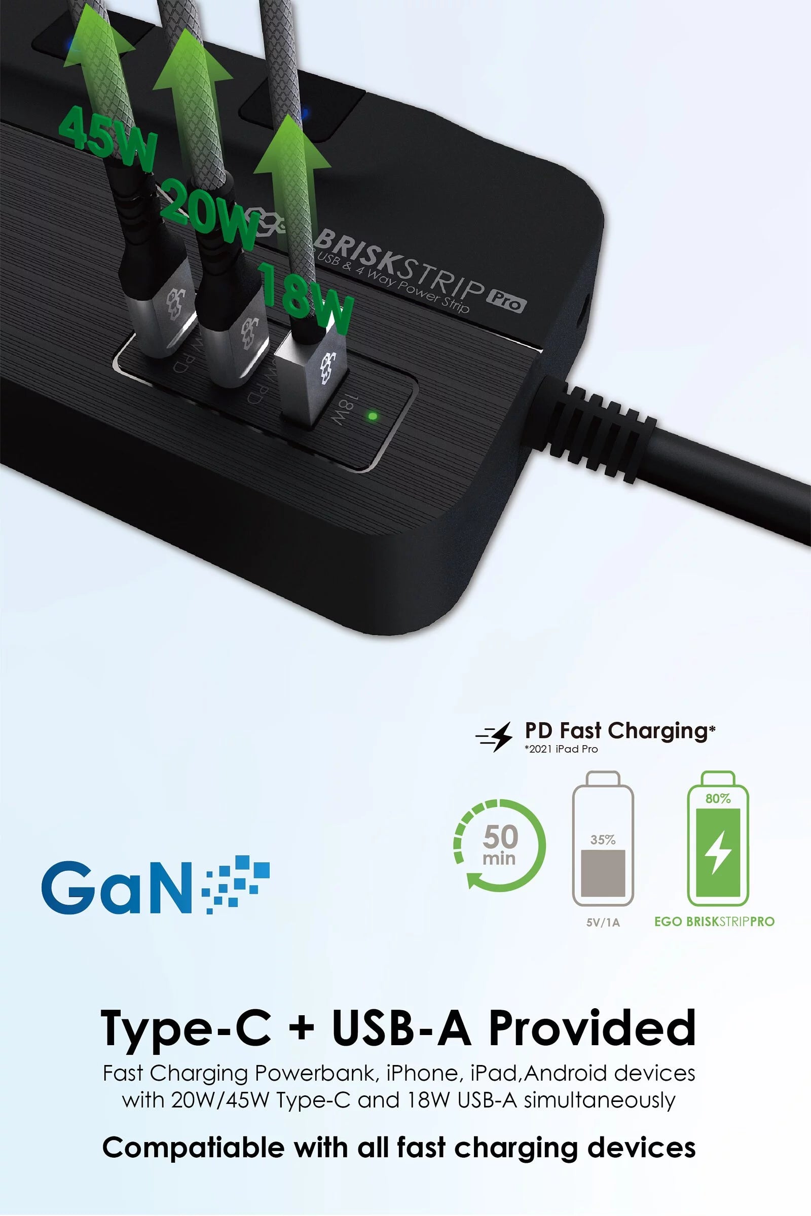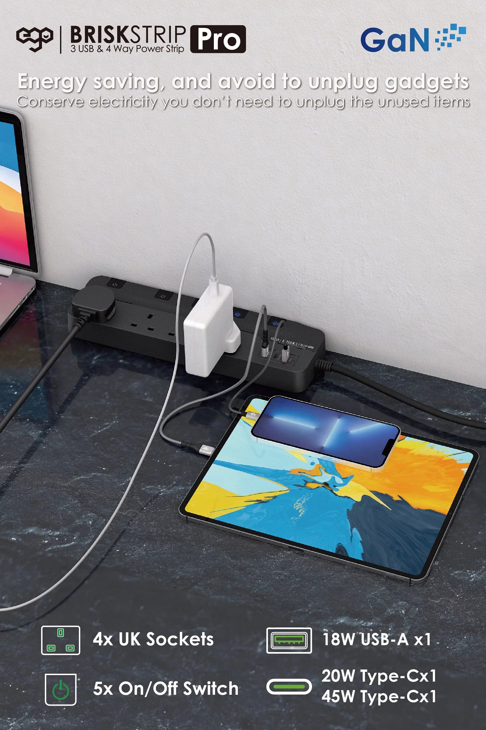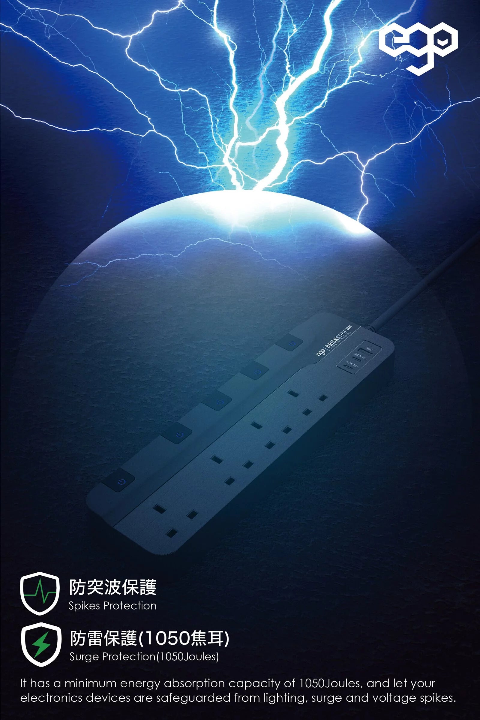 EGO BRISK STRIP PRO GAN PD45w 3USB & 4位 防雷Type C拖板 [香港行貨]