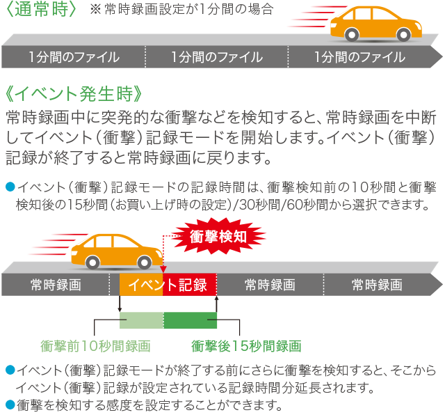 事件錄影功能會在駕駛過程中,當重力感測器偵測到突然撞擊或車速突然變化時,記錄其前後一段設定的畫面。手動錄影功能可在需要時按下錄製按鈕開始錄製。