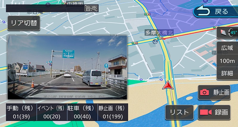 操作導航系統即可進行“同步回放”,即在播放前後相機拍攝的影像時,導航畫面上可切換前後影像。此時,車載導航畫面也會在前後影像之間切換。此外,車載導航地圖畫面上還可顯示PinP(畫中畫),方便您一邊查看地圖一邊查看即時行車影像。